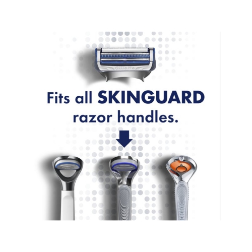 Gillette's first clinically proven razor designed for sensitive skin, with SkinGuard technology between the blades. Gillette SkinGuard men's blade refills have a unique SkinGuard between the blades to shave hair and guard skin. The SkinGuard reduces blade contact with the skin. Each blade refill also features 2 optimally-spaced, low cutting force blades to minimize tug and pull, and lubrication before and after the blades to minimize friction and shield skin from irritation.