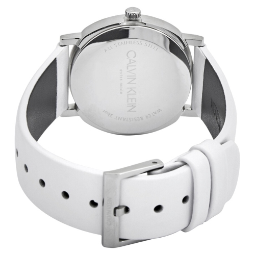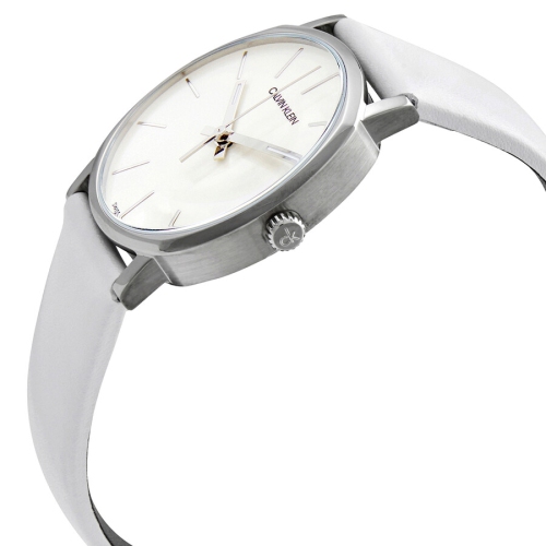 Stainless steel case with a white leather strap. Fixed stainless steel bezel. White dial with luminous silver-tone hands and index hour markers. Dial Type: Analog. Luminescent hands. ETA caliber F05.101 quartz movement. Scratch resistant mineral crystal. Pull / push crown. Solid case back. Round case shape. Case size: 32 mm. Case thickness: 7.97 mm. Band width: 16 mm. Tang clasp. Water resistant at 30 meters / 100 feet. Functions: hour, minute, second. Casual watch style. Watch label: Swiss Made. Calvin Klein Posh Quartz White Dial Ladies Watch K8Q331L2.