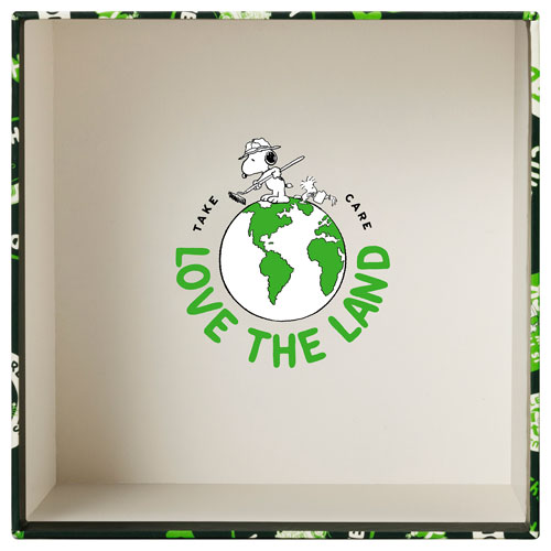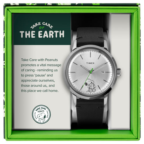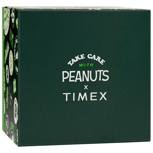 40mm stainless steel case is enhanced with a silver-tone dial, Peanuts graphics, and a green second hand
