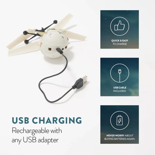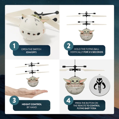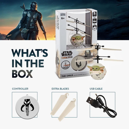 Introducing the Star Wars Mandalorian The Child ( Baby Yoda ) IR UFO Heli Ball! Featuring a coaxial rotor system for precise movement and increased stability when hovering. The UFO Ball Helicopters body is also constructed with a durable material making it strong yet lightweight so you don't have to worry about breaking anything when it lands a bit too rough. Using infrared motion sensitive technology, the UFO ball will detect nearby objects and is programmed to move away from them. Simply turn on and launch to get started, holding your hand underneath it will keep it hovering up in the air.