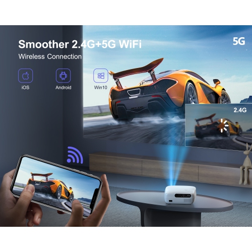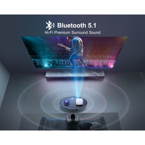 【5G/2.4G Fastest Dual-Band WiFi & Newest Bluetooth 5.1 Projector】K7 indoor and outdoor projector with fastest 5G&2.4G dual-band WiFi, which can make image and video transmission 2 times smoother than other 5G wifi projectors. In addition, it is built-in Bluetooth 5.1 chip with SRS sound system which can connect with most Bluetooth headsets, Bluetooth speakers and Airpods. It will store every detailed sound effect to bring you into different sound scenes.