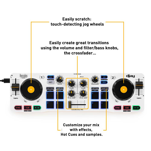 14cm (5.5”) jog wheels control play/pause, cue, shift, and sync with convenient touch detection
