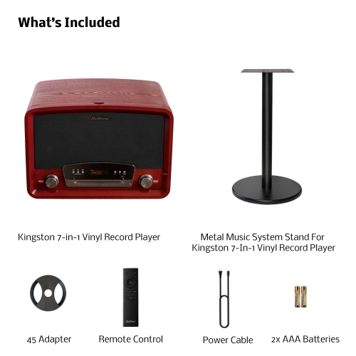What's Included: 7-in-1 Vinyl Record Player, 45 Record Adaptor, Remote Control, Power Cord, 2 AAA Batteries, User Manual, 1 Top Plate, 1 Metal Pole, 1 MDF Base, 4 16mm Screws, 4 22mm Screws, 4 Washer, 4 Spring Washer, Instruction Manual, Quick Start Guide, 1 Year Manufacturer's Warranty, Lifetime Customer Support