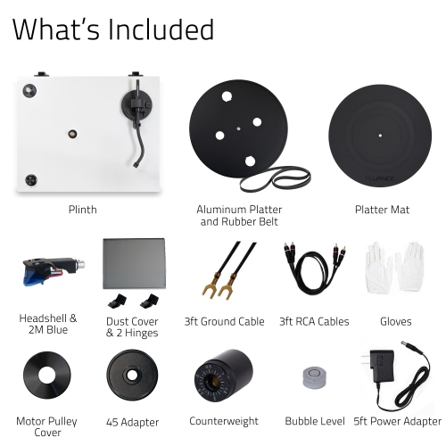 What's Included: RT84WH Turntable, Dust Cover + Hinges, Bubble Level, Headshell with Ortofon 2M Blue Cartridge, Counterweight, Aluminum Platter with Rubber Mat and Belt, 100-240V (50/60Hz) AC Power Adapter, 3ft RCA Cable, 2x 3ft Ground Wire, 45 Adaptor, Motor Pulley Cap, Cotton Gloves, User Manual, Lifetime Customer Support, 2 Year Manufacturer's Direct Warranty