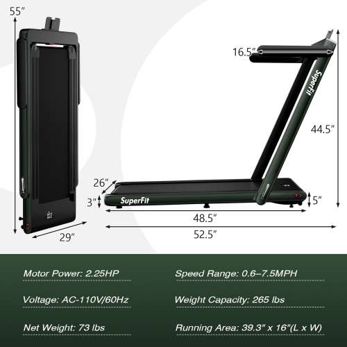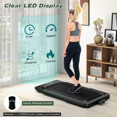 This 2 in 1 treadmill is suitable for office, gym and home use to help build a healthy body. Built-in powerful 2.25HP motor helps you thoroughly workout your body. Low noise design gives you a quiet sporting environment. 5 layers non-slip running belt will greatly absorb shock to provide cushioning for knee, muscle and joints. You can connect this treadmill to your phone through the built-in Bluetooth, so you can enjoy music and movies while exercising. Use the remote controller to change the speed or stop the running machine. And the LED display makes it easy for you to track speed, distance, time and calories when you exercise. You don't need any extra assembly before you run on it. The front wheels together with the foldable design will help you move or store it in a small place. Start exercising now!