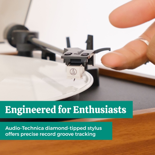 Developed with an aluminum tonearm isolated from the anti-resonant platter to improve record groove contact and reduce unwanted vibrations from affecting your music. Paired with Audio-Technica's diamond-tipped needle renowned for its durability and reputation for delivering accurate sound reproduction with extended playing time.