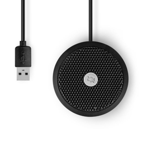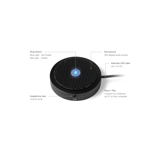 Easy Mute Button. Simply press the button on top of the unit to mute (red light) and unmute (blue light) the microphone.