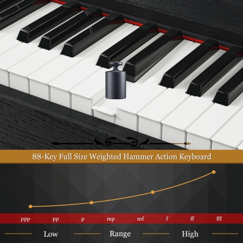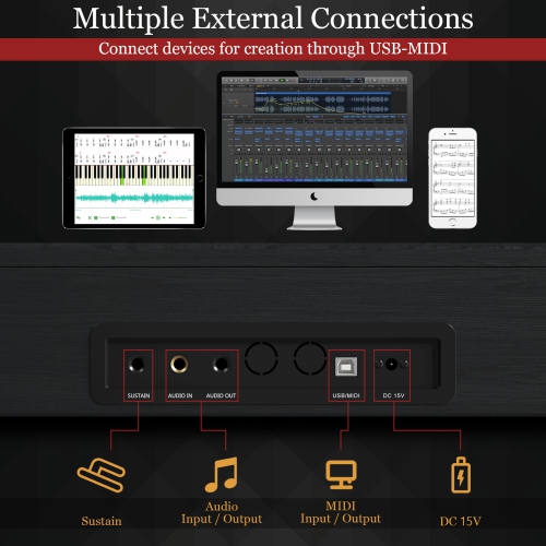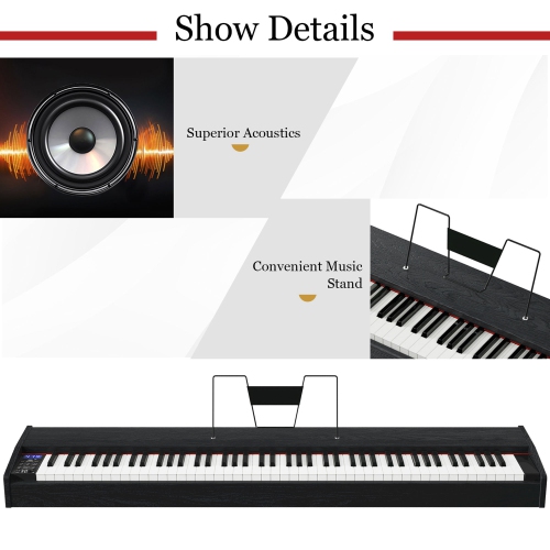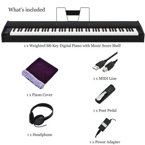 Our 88 key weighted keyboard with dual-tone modes combines two voices together, like piano and drum, inspiring users to make new creation as well as providing users with acoustic timbre and a wonderful playing experience. In addition, our piano has 480 tones, 200 rhythms, 64 polyphonies and 80 demos for users to choose. And recording and following-playing functions can facilitate your intelligent learning. In order to improve learning efficiency, we added MIDI/USB interface to connect piano to electric devices. Apart from that, headphone, two 10W of built-in speakers and single sustain pedal provide users with professional playing experience. If you are looking for a weighted 88-key digital piano, please take it home!