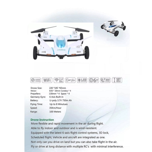 Remote Control Car Drone. Drive or Fly. Fun and Easy to use. One button touch to do easy flips in the air. Driving functions - Forward, Reverse, Right Left. Balance functions on controller for easy flying. Fly's well in windy conditions.