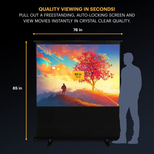 With this easy-to-use, convenient projector screen and stand, you just need to set up the feet, open the case, and pull out your screen. The projection screen is super easy to set up. Enjoy using this useful, indoor/outdoor projector screen in the comfort of your home or outside under the night sky. The matte white screen controls ambient lighting and prevents pixelation so you always have a clear display. The black masking border enhances contrast while the black backing prevents light penetration. The 160° viewing angle creates clear, wide images making this screen great for weddings, conferences, parties, and other events with big crowds. Enjoy beautiful, colorful cinema on this high-quality screen.