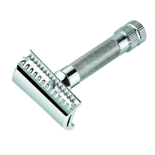 The MERKUR 37C razor is a slant bar razor for wiry and dense beards. Due to its weight and slant bar head, it can handle even the most difficult tasks easily and thoroughly. Its no wonder that fans call it €œthe sledgehammer€. With the barber pole-shaped, ribbed handle, you have it safely and comfortably in your hand.