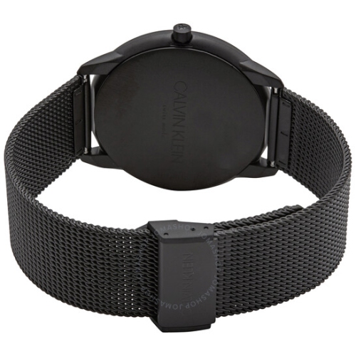 Black PVD stainless steel case with a black PVD stainless steel mesh bracelet. Fixed black PVD bezel. Black dial with silver-tone hands. No markers. Dial Type: Analog. Quartz movement. Scratch resistant mineral crystal. Pull / push crown. Solid case back. Round case shape. Case size: 40 mm. Case thickness: 7 mm. Band width: 22 mm. Fold over slip through clasp. Water resistant at 30 meters / 100 feet. Functions: hour, minute. Minimal Series. Casual watch style. Watch label: Swiss Made. Calvin Klein Minimal Quartz Black Dial Men's Watch K3M5T451.