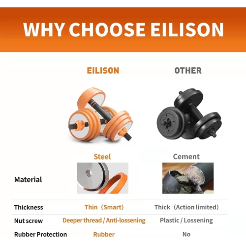 EILISON Dumbbell set can be used at home and in the gym to enhance muscle strength, burn calories and improve muscle training. Use dumbbells regularly to strengthen abdominal muscles, Biceps, Triceps, Gluten muscles, shoulders, Legs, Knees, Quadriceps, and hips.