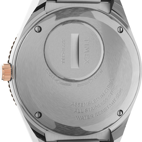 36mm stainless steel case is enhanced with a rose gold-tone rotating bezel, silver-tone dial, functional battery hatch, and domed acrylic crystal