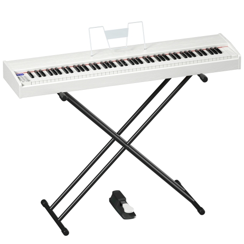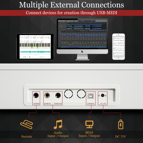 Our 88 key weighted keyboard with dual-tone modes combines two voices together, like piano and drum, inspiring users to make new creation as well as providing users with acoustic timbre and a wonderful playing experience. In addition, our piano has 480 tones, 200 rhythms, 64 polyphonies and 80 demos for users to choose. And recording and following-playing functions can facilitate your intelligent learning. In order to improve learning efficiency, we added MIDI/USB interface to connect piano to electric devices. Apart from that, headphone, two 10W of built-in speakers and single sustain pedal provide users with professional playing experience. If you are looking for a weighted 88-key digital piano, please take it home!