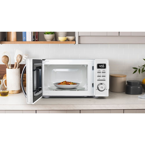 GE 0.7 cu. ft. Small Countertop Microwave Oven | Includes Optional Hanging Kit | 700 Watts | Kitchen Essentials for the Countertop, White (JEM3072DHWW)