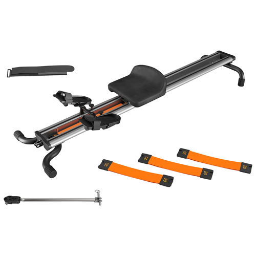 Includes rower, TUT trainer tower connector, three 20lbs of TUT dynamic resistance band plates, and a velcro belt to fasten the rower to the tower for storage