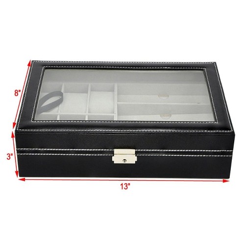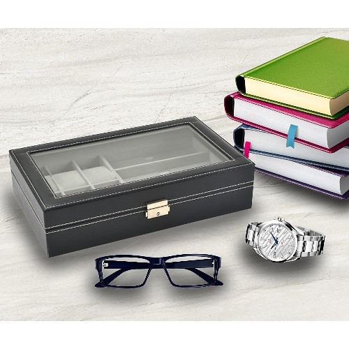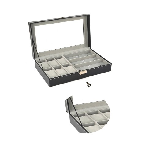 6 watch slots and 3 compartments for glasses, sunglasses and Suits for storing jewelry, cuff links,rings,earrings,bracelets and necklaces
