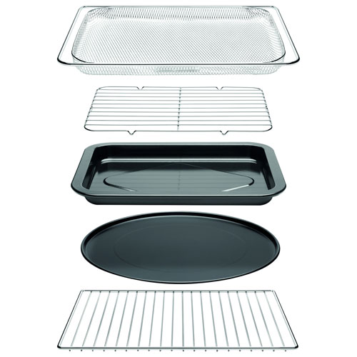 Includes deep pull-out crumb tray, 13-inch non-stick pizza pan, enamel baking pan, enamel broil rack, and air fry mesh basket