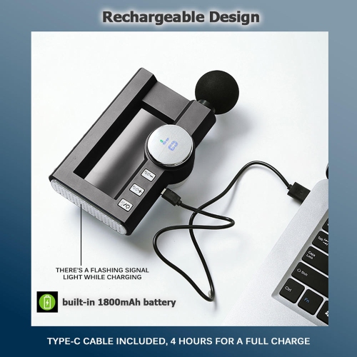 Packing Lists: 1 x Massage Gun, 4 x Massage Head, 1 x Type-C Cable, 1 x User Manual
