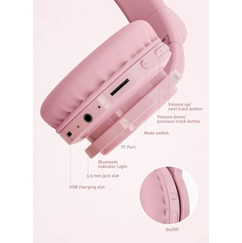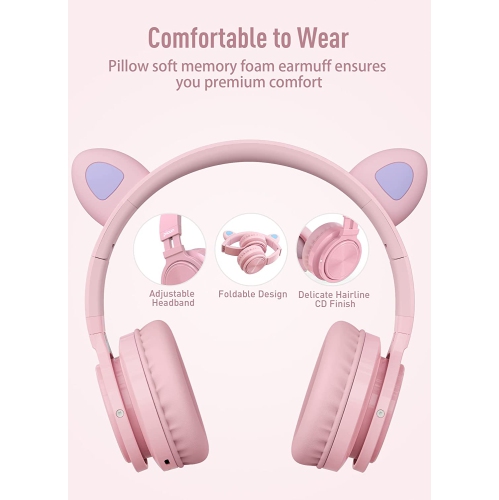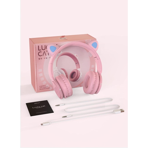 A Cute Twist to Standard Headphones: Adorable cat ears light up with 7 different colors from integrated LEDs. LEDs can be turned on and off. Bluetooth 5.0 with Microphone: With the latest updates, Bluetooth 5.0 brings increased transmission rates, stability, and range. When paired with your mobile device you can take calls while listening to your favorite music. Comfortable, Adjustable, yet Compact: Padded and adjustable headband fits all head sizes. Over the ear pads block out external noise and maximize comfort around delicate ears. Fold away for compact storage. Wired/ Wireless Enabled: A long lasting, integrated, rechargeable 500mAh battery provides up to 40 hrs of combined listening and talk time on a single charge. Passive bypass allows for continued listening if battery is drained. Compatibility: Compatible with virtually all smartphones, tablets, computers, etc. with enabled Bluetooth.