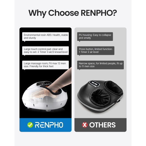 With its enlarged foot rooms, RENPHO foot massager can accommodate most foot sizes, up to men size 12. Everybody needs a daily foot massage. Get it for yourself or your friend using the foot massager 30 minutes daily improves the health of the body.