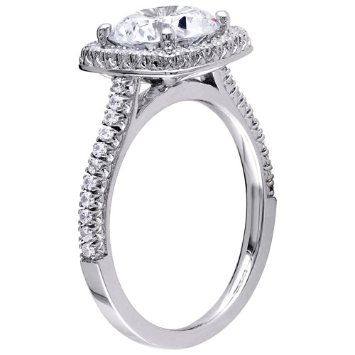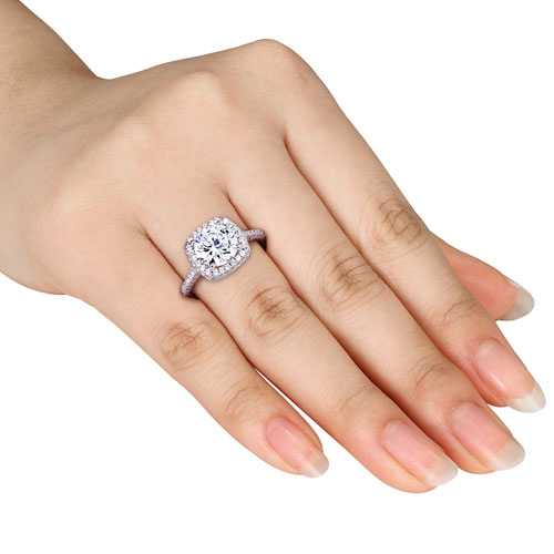 Features a massive 9mm round-cut cubic zirconia stone with a halo of 47 round-cut cubic zirconia side stones