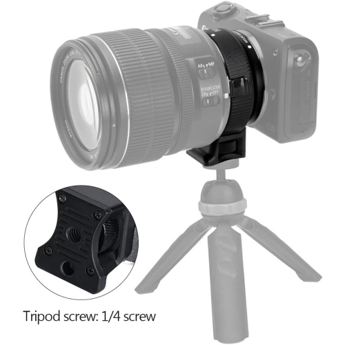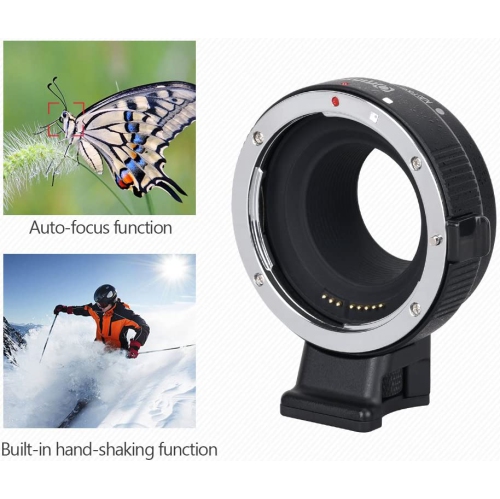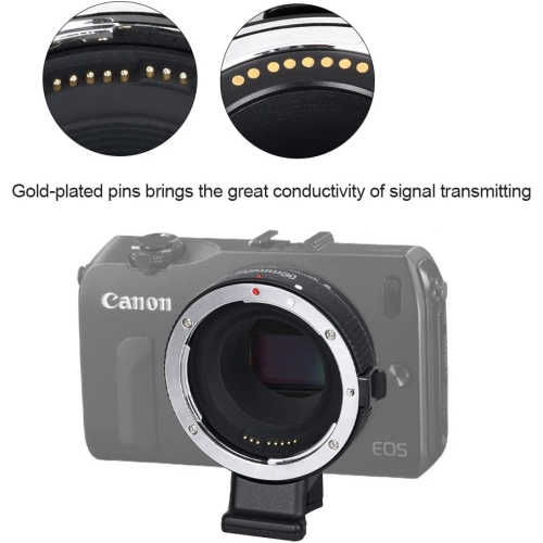(Compatibility)EF-EOS M mount adapter ring allows Canon EF and EF-S mount series lenses to be mounted on Canon EOS-M mirrorless digital camera. Please contact us if you're not sure whether this lens adapter ring fits for your camera. Please refer to the compatibility table before you purchase our CM-EF-EOS M lens mount adapter. (AF function & Aperture Control)This EF-EOS M lens converter has a built-in aperture motor and electronic contact, which can control the aperture of the lens by means of electronic contact. The aperture control function almost supports all Canon EOS M cameras, and you can also adjust the aperture directly from the camera side. (EXIF signal transmitting)Use gold-plated needle PIN to transmit signal, greatly enhancing its transmission performance (Built-in IS Stabilization)Built-in IS stability, making focus more accurate and clear and better helping you take pictures; please set your camera APS-C Size Capture to 'off' if you get your lenses to function as fu