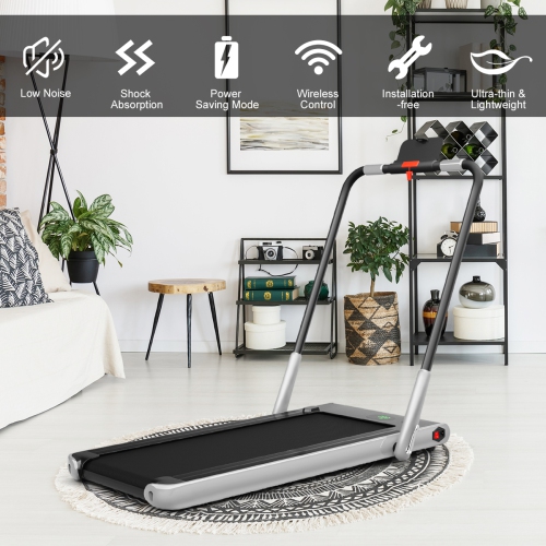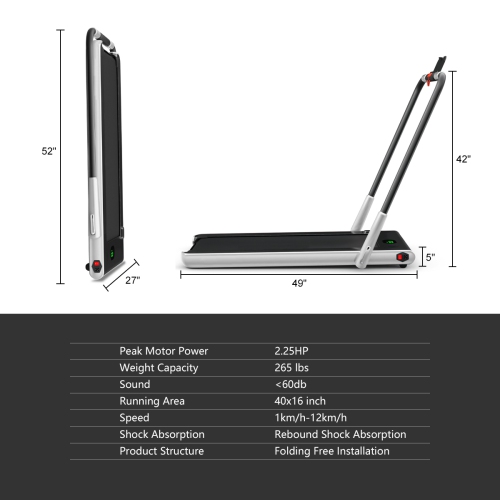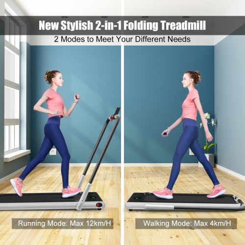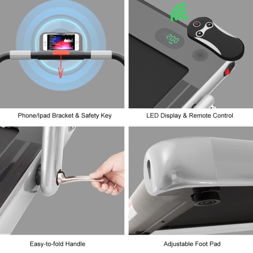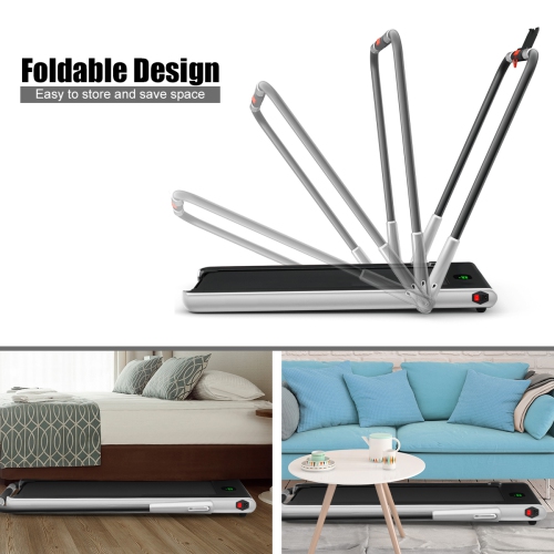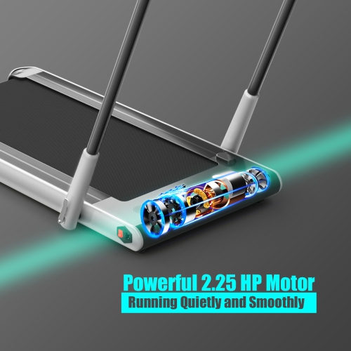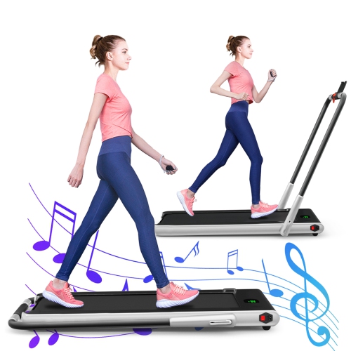 This 2 in 1 treadmill is suitable for office, gym and home use to help have a healthy body. You can use it to walk steadily or run fast to shape your body. Built-in powerful 2.25HP motor helps you thoroughly workout your body. Low noise design gives you a quiet sporting environment. 5 layers non-slip running belt will greatly absorb shock to provide cushioning for knee, muscle and joints. You can connect this treadmill to your phone through the built-in Bluetooth, so you can enjoy music and movies while exercising. Use the remote controller to change the speed or stop the running machine. And the LED display makes it easy for you to track speed, distance, time and calories when you exercise. The front wheels together with the foldable design will help you move or store it in a small place. Start exercising now!