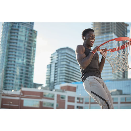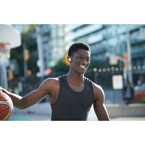 Umbrella-shaped tip and extended flexible wing keep the earbuds securely in place without the need for an ear hook