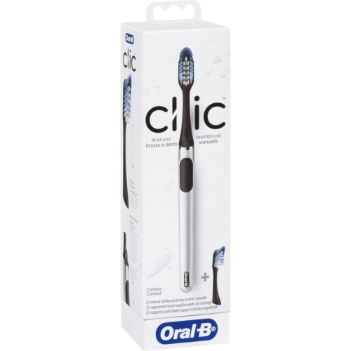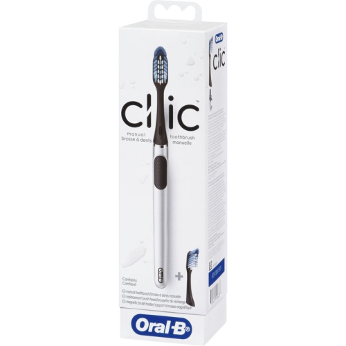 Oral-B Clic Manual Toothbrush delivers next-gen cleaning performance from Oral-B. It offers exceptional plaque-removal performance, removing plaque on teeth and along the gum line. Brush heads are designed by dentists and feature multiple patented technologies, giving you a remarkable cleaning performance and a truly comfortable brushing experience. The handle is beautifully designed and durable, made out of a unique composite material, largely based on natural minerals & equipped with the unique CLICfit mechanism. Oral-B Clic features a replaceable brush head so that it uses up to 60% less plastic over two years*. Oral-B Clic. Expect more from a toothbrush.