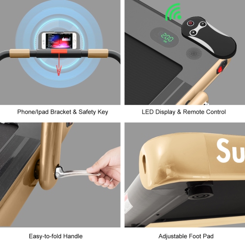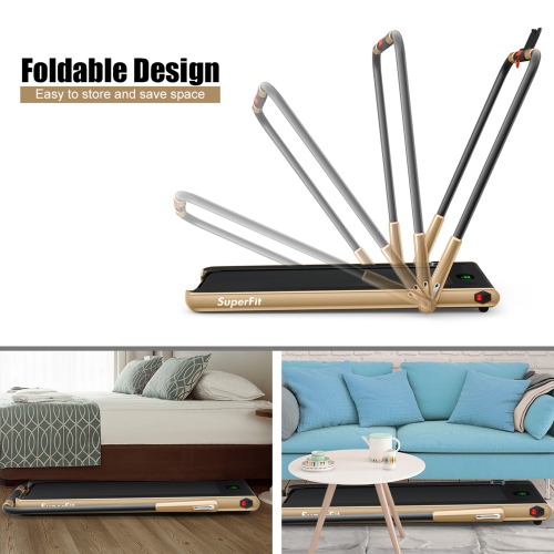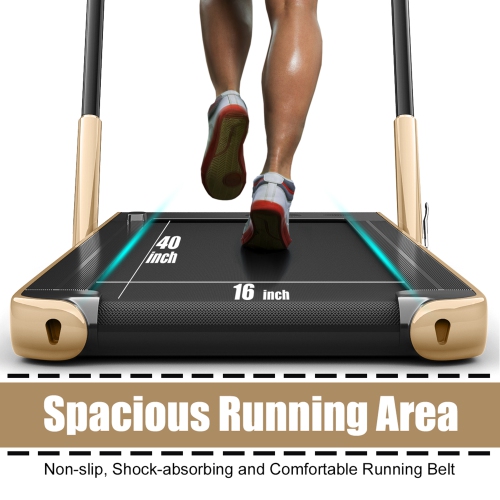This 2 in 1 treadmill is suitable for office, gym and home use to help have a healthy body. You can use it to walk steadily or run fast to shape your body. Built-in powerful 2.25HP motor helps you thoroughly workout your body. Low noise design gives you a quiet sporting environment. 5 layers non-slip running belt will greatly absorb shock to provide cushioning for knee, muscle and joints. You can connect this treadmill to your phone through the built-in Bluetooth, so you can enjoy music and movies while exercising. Use the remote controller to change the speed or stop the running machine. And the LED display makes it easy for you to track speed, distance, time and calories when you exercise. The front wheels together with the foldable design will help you move or store it in a small place. Start exercising now!