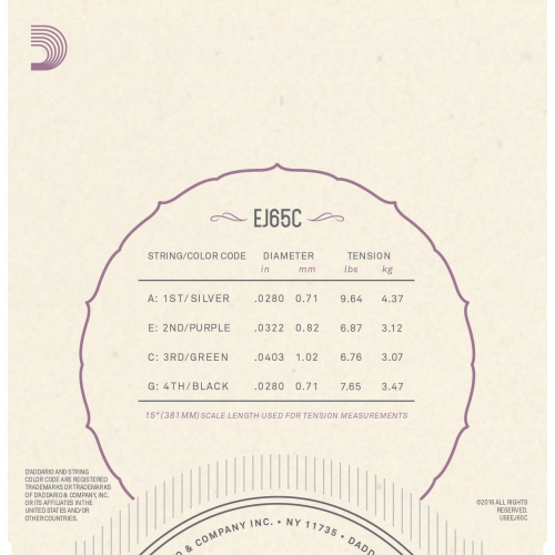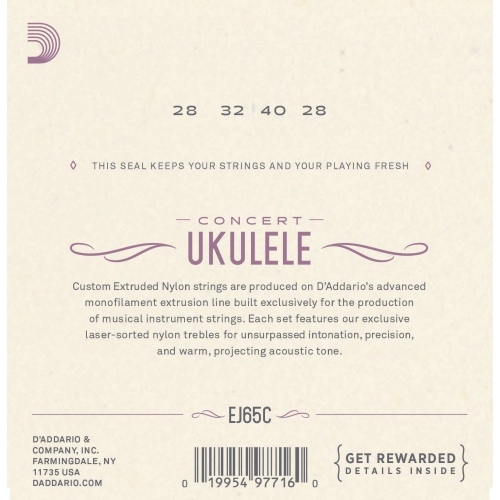 The EJ65C is an all-nylon string set designed for use with concert ukuleles. Each string is manufactured on D’Addario’s own advanced monofilament extrusion line built exclusively for the production of musical instrument strings. This set is optimized for usage with standard GCEA tuning.