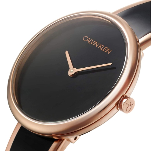 Rose gold PVD stainless steel case with a rose gold PVD stainless steel bracelet with a black resin inlay. Fixed rose gold PVD bezel. Black dial with rose gold-tone hands. No markers. Dial Type: Analog. Quartz movement. Scratch resistant mineral crystal. Pull / push crown. Solid case back. Round case shape. Case size: 30 mm. Fold over clasp. Water resistant at 30 meters / 100 feet. Functions: hour, minute. Seduce Collection Series. Dress watch style. Watch label: Swiss Made. Calvin Klein Seduce Collection Quartz Black Dial Ladies Watch K4E2N611.