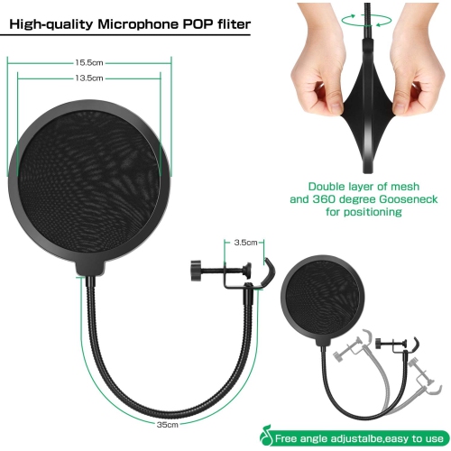 FILTERABLE, ADJUSTABLE & FLEXIBLE: The screen pop filter comes from a double-layer mesh design, which can filter out all unnecessary background noises. With 360 degrees gooseneck feature, this flexible pop filter is used for precise positioning and thus, allowing you to adjust the right angle to show your perfect voice. The four extra cable ties can help secure the mic cable during installation.
