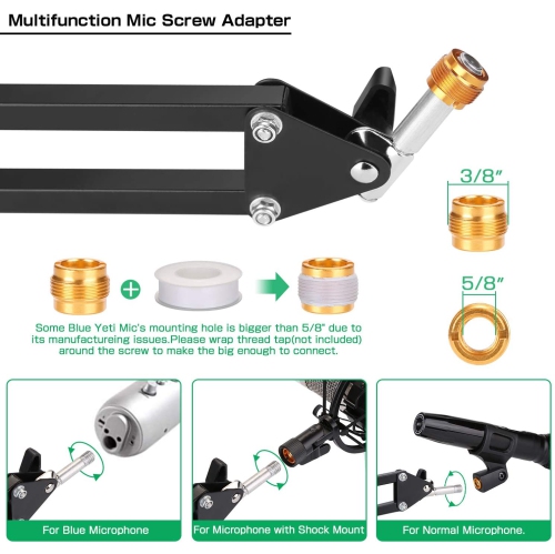 ATTENTION: Please note that the mounting hole in the Yeti microphone is only slightly larger than 5/8’’ industry standard due to the manufacturing issues. Here is the suggestion, please use the thread tape (not included) to wrap around the mounting screws on the arm stand and in this way, it can effectively increase the thickness of mounting screws so that it can connect to Yeti mic in a convenient way.