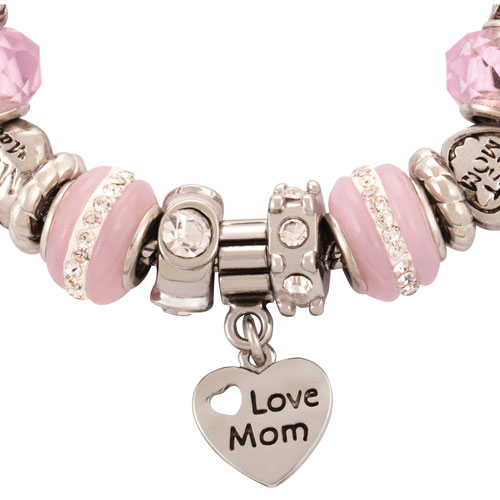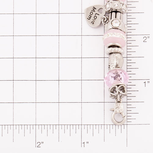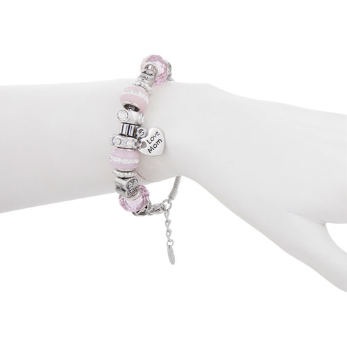 Five beautiful Italian Murano glass pearlescent coloured beads in a pink theme complete with a "Love mom" heart charm will dress up your wrist beautifully