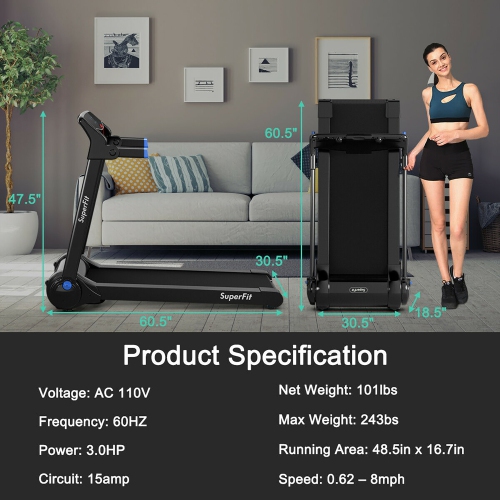 The sturdy motorized treadmill can support up to 242.5 lbs