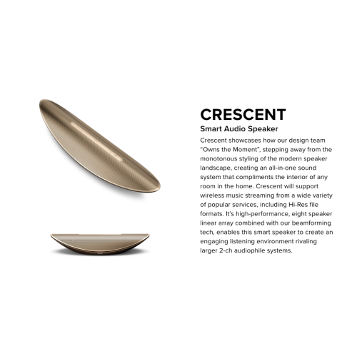 Crescent showcases how our design team “Owns the Moment”, stepping away from the monotonous styling of the modern speaker landscape, creating an all-in-one sound system that compliments the interior of any room in the home. Crescent will support wireless music streaming from a wide variety of popular services, including Hi-Res file formats. It's high-performance, eight speaker linear array combined with our beamforming tech, enables this smart speaker to create an engaging listening environment rivaling larger 2-ch audiophile systems.