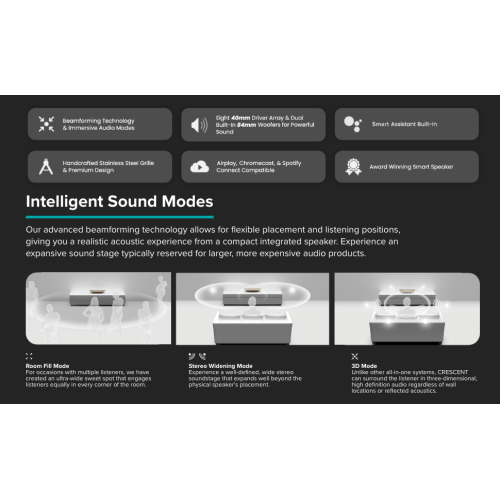 Unlike previous all-in-one systems, Crescent can surround the listener in three-dimensional, high definition audio regardless of wall locations or reflected acoustics.