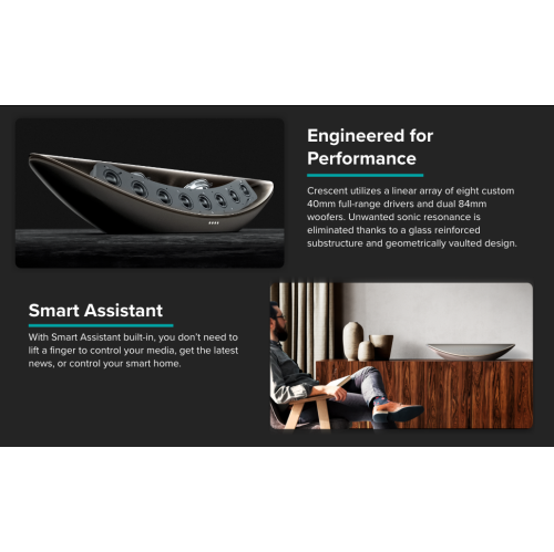 Crescent utilizes a linear array of eight custom 40mm full-range drivers and dual 84mm woofers. Unwanted sonic resonance is eliminated thanks to a glass reinforced substructure and geometrically vaulted design.