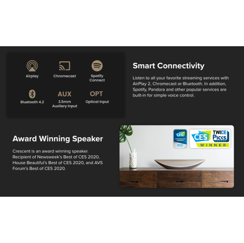 Crescent is an award winning speaker. Recipient of Newsweek’s Best of CES 2020, House Beautiful’s Best of CES 2020, and AVS Forum’s Best of CES 2020.