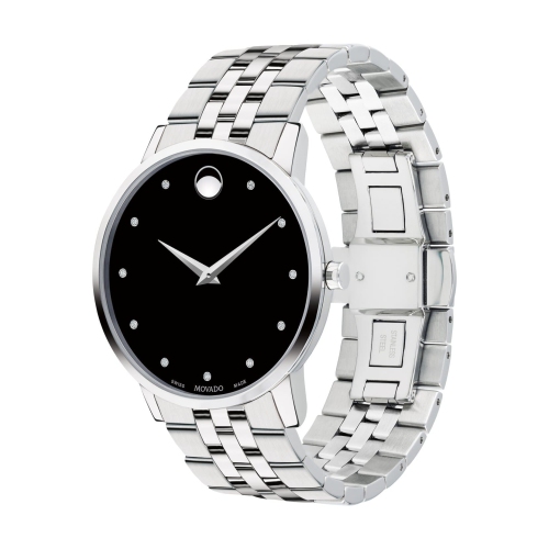 Mens museum classic watch, 40 mm stainless steel case, round black dial with 11 diamond markers (0.043 t.c.w.) and silver toned dot and hands, stainless steel link bracelet with push button deployment clasp. Quartz movement. Water resistance up to 30 meters. Scratch resistant sapphire crystal.