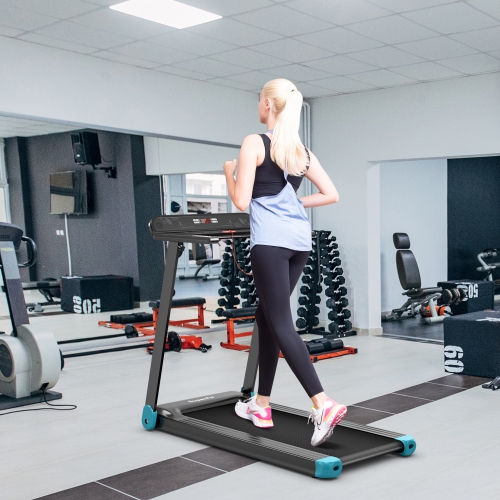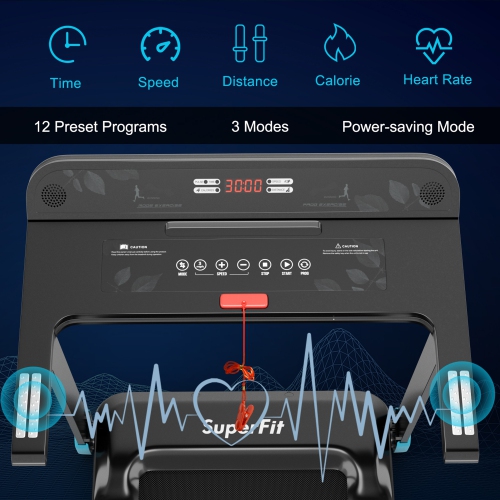 No time for gym? This folding treadmill is the perfect solution for you! The powerful motor provides 0.6 - 7.5 MPH adjustable speed, 12 preset programs and 3 modes for you to exercise effectively, so you can walk, jog and run on it. And it will not disturb your family with quiet performance. Additionally, the 5-layer shockproof and anti-slip running belt and safety key ensure your safety while running. Moreover, sports data (time, speed, distance, calorie and heart rate) can be feedback directly through LED monitor. To make running more interesting and convenient, this running machine can be connected with your phone/tablet via bluetooth. Thus, you are able to listen to the music through bluetooth speaker and control the treadmill through GYMAX APP.