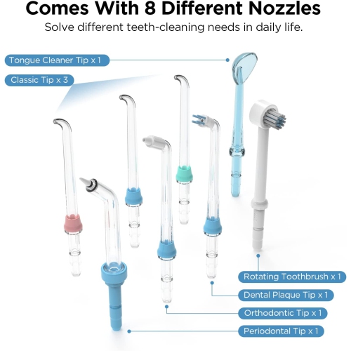 8 JET TIPS FOR DIFFERENT NEEDS: Our countertop oral irrigator comes with 3 ordinary high-pressure jet tips and 5 special-use jet tips (orthodontic tip * 1, tongue cleaner tip * 1, periodontal tip * 1, dental plaque tip * 1, rotating toothbrush * 1). Different jet nozzles can clean the teeth and the gingival sulcus and other places where the toothbrush can not get to. It can help eliminate the bad breath caused by poor oral hygiene, and provide you a comprehensive oral cleaning.