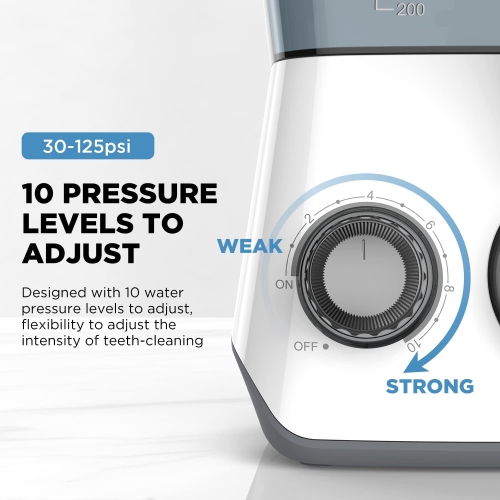 10 WATER PRESSURE TO ADJUST: 10 water pressure adjustment from WEAK to STRONG to serve your different oral hygiene needs. Low water pressure is recommended for kids and those with sensitive teeth and the beginners. Medium water pressure fits for most people. High water pressure is suitable for adults and experienced users. Easy operation is friendly for first-time users, the aged, and kids. It will automatically switch off after operating for 3 minutes.