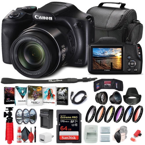 Characterized by its long-reaching zoom, the Canon PowerShot SX540 HS Digital Camera is also benefitted by the inclusion of a 20.3MP High-Sensitivity CMOS sensor and DIGIC 6 image processor to realize notable image quality, sensitivity to ISO 3200, and 5.9 fps continuous shooting, as well as the ability to record full HD 1080p video at 60 fps. The 50x optical zoom lens covers a 24-1200mm equivalent focal length range, spanning wide-angle to super telephoto perspectives, and an Intelligent IS image stabilization system supports this range by minimizing the appearance of camera shake when shooting both photos and movies. Balancing this extended reach, an ergonomic body design incorporates a large grip for further stability, as well as a large 3.0" 461k-dot LCD for composing imagery and reviewing photos and movies. Additionally, built-in Wi-Fi with NFC allows you to wirelessly share your imagery directly to a linked smartphone or tablet.