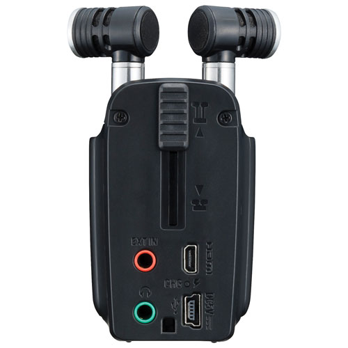 Integrated stereo microphones can be configured for A/B for capturing space and ambience or X/Y for capturing natural depth and width