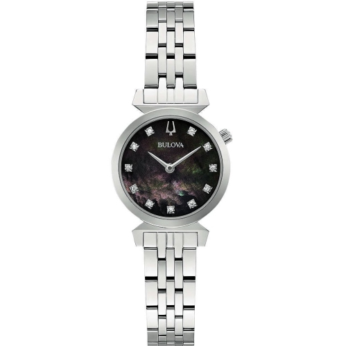Inspired by Bulova heritage timepieces, the petite stainless steel Regatta features a lustrous black Mother-of-Pearl dial set with 11 diamonds. Signature Regatta design details feature the crown at the 2 o’clock position and distinct angled lugs. Flat sapphire crystal, slim quartz movement, and water resistance to 30 metres. Case size 24mm.