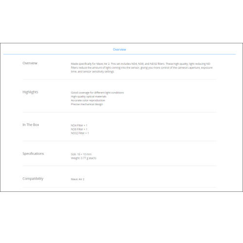 Made specifically for Mavic Air 2. This set includes ND4, ND8, and ND32 filters. These high-quality, light reducing ND filters reduce the amount of light coming into the sensor, giving you more control of the camera's aperture, exposure time, and sensor sensitivity settings.